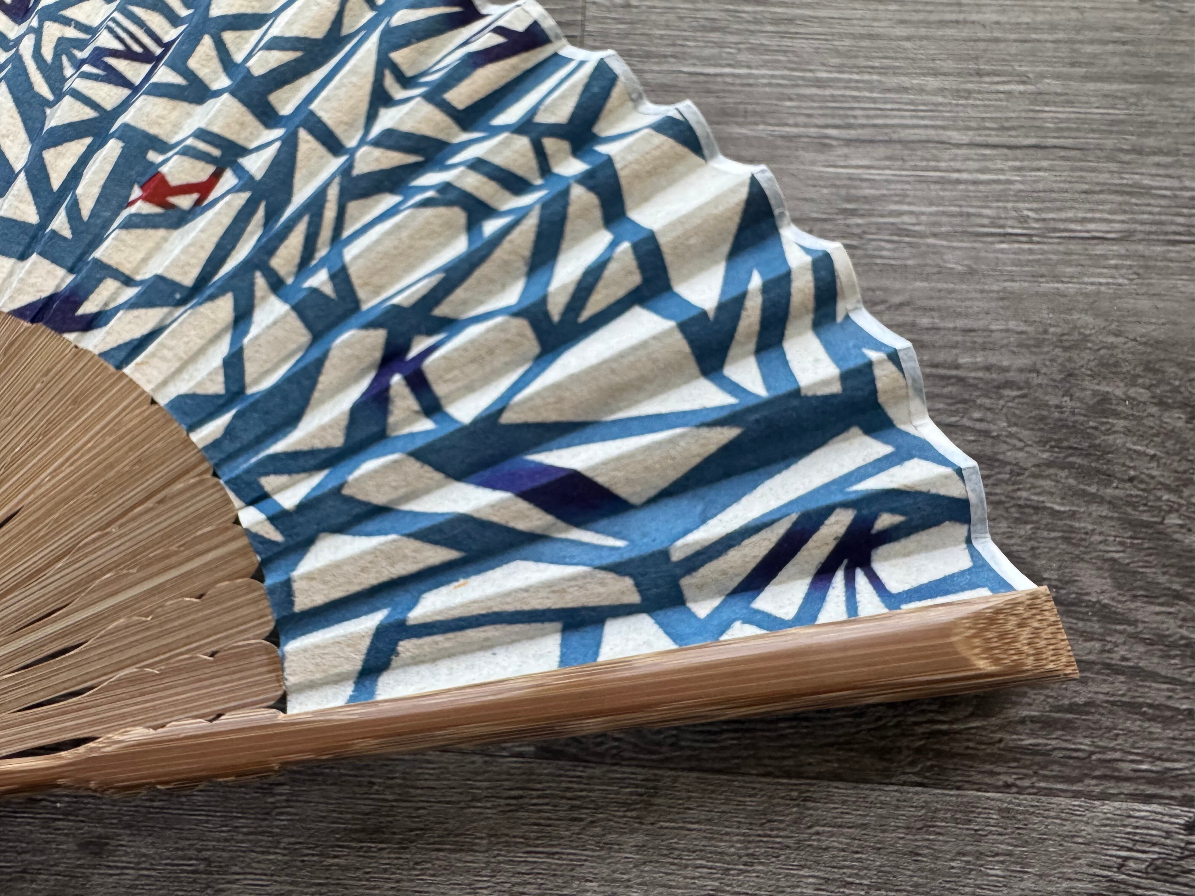 この扇子は京都の職人によって仕立てられた手染めの紅型月桃紙を使用しています。温かみのある色合いとKATACHIKIオリジナルデザインが特徴で持ち運ぶだけで気分が華やぎます。