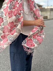 ブーゲンビリアをモチーフにした紅型手染めストール、エリ蚕のシルクに染めているため薄手でとても軽い質感のある一枚です。