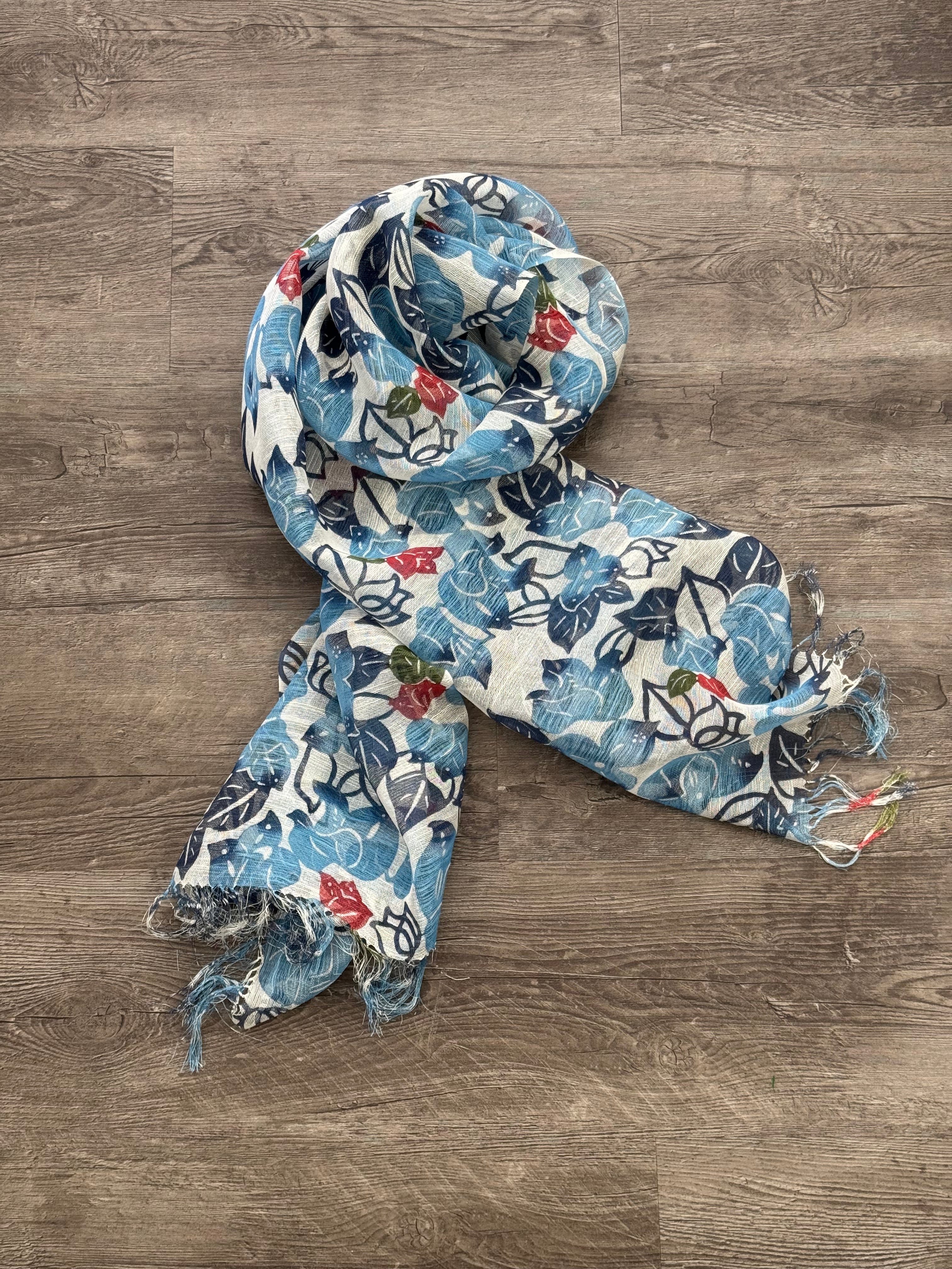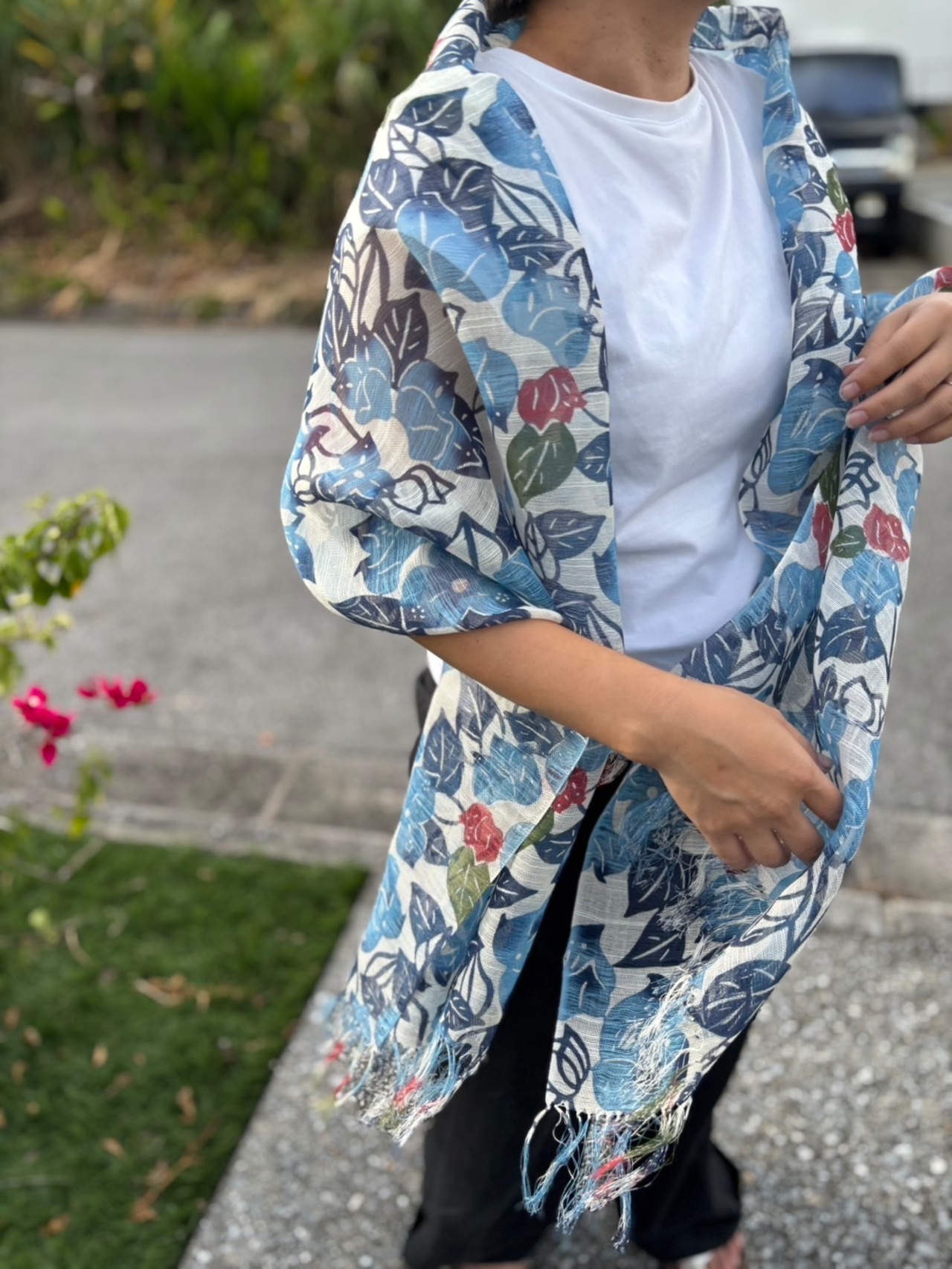 ブーゲンビリアをモチーフにした紅型手染めストール、スラブ織という緯糸の太さがランダムになっている変化のある素材です。