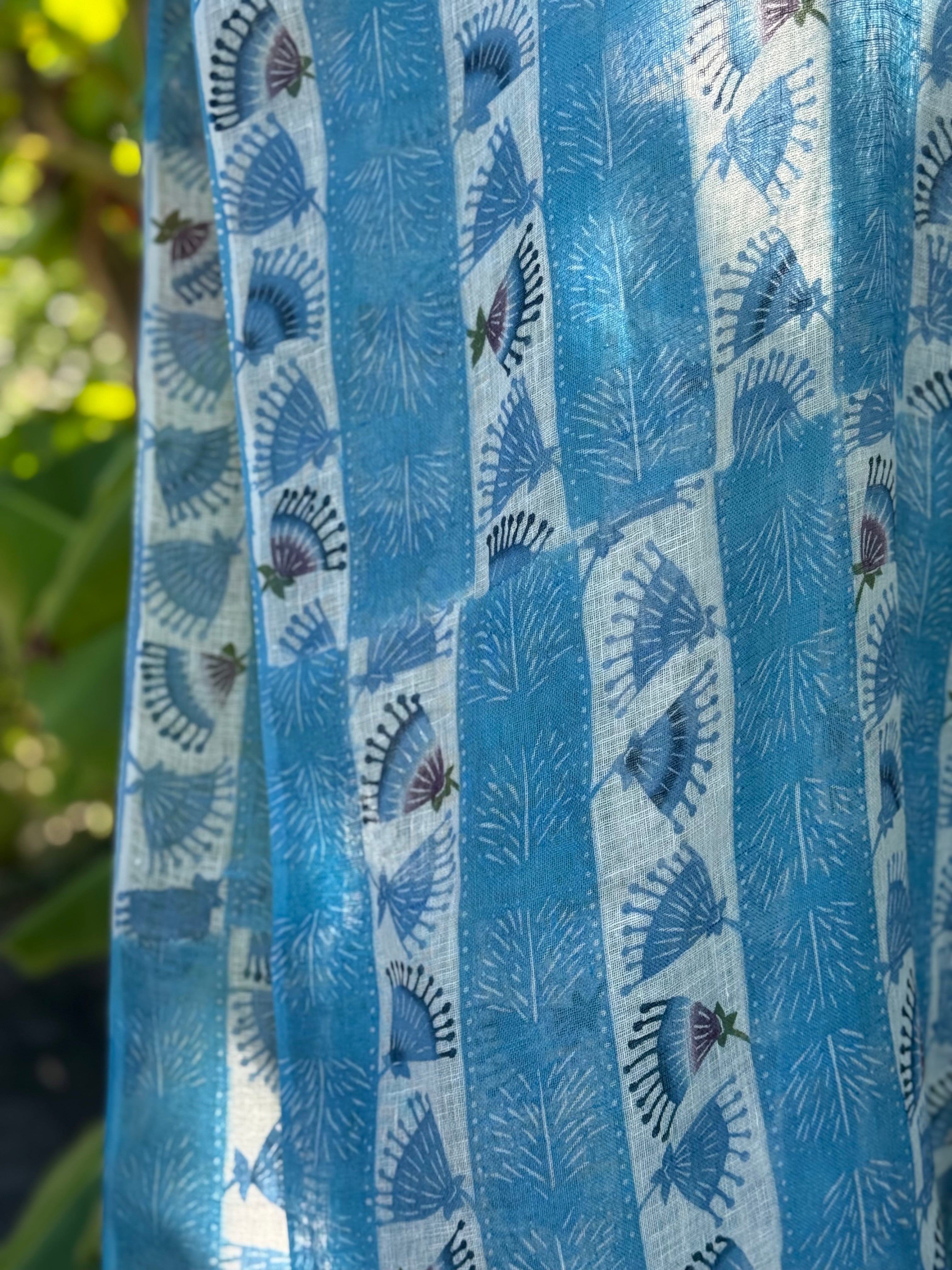 夜にひっそり咲くサガリバナ。たわわに連なって咲く花をモチーフにしてインドリネンの生地に染めました。
