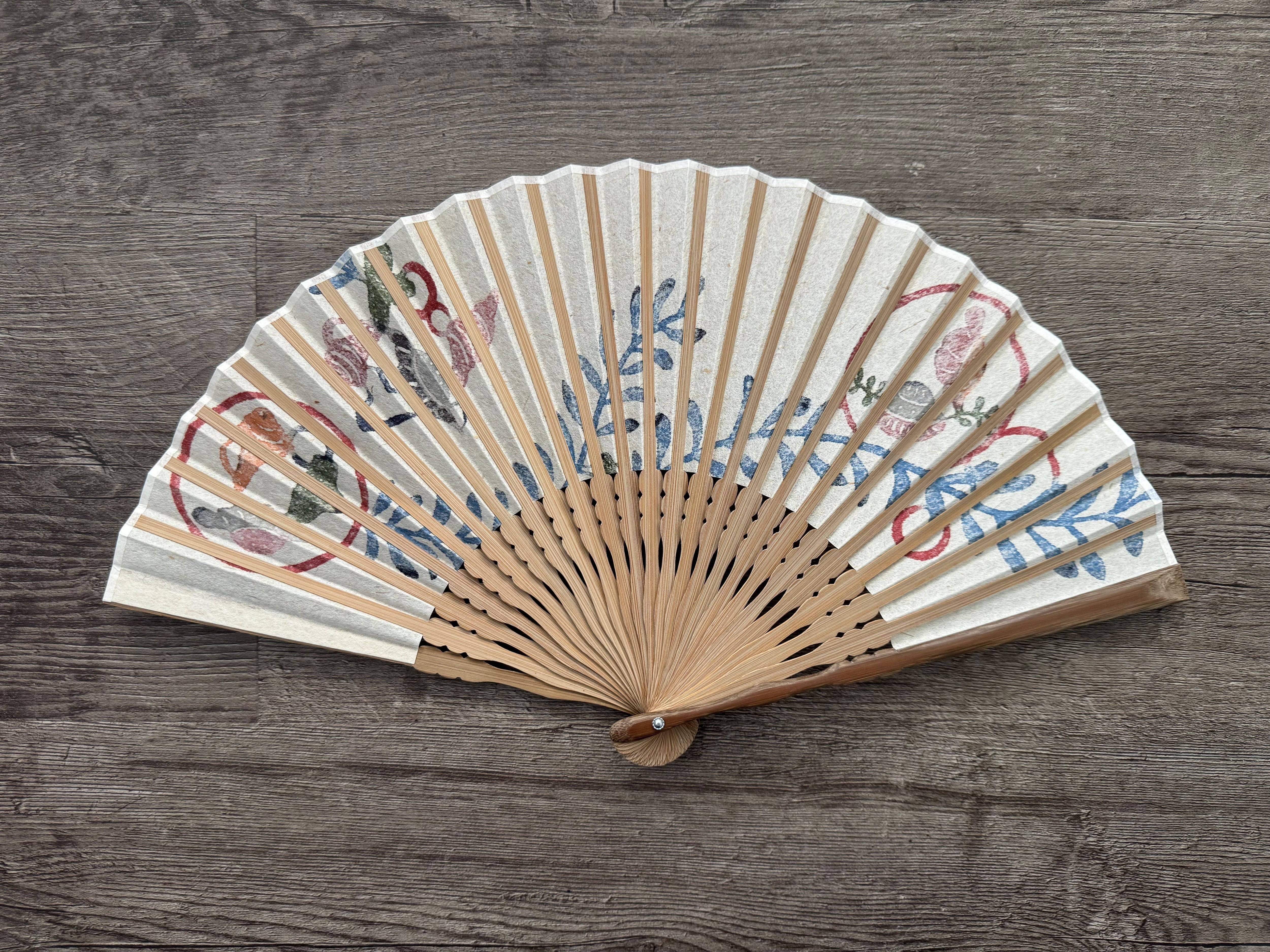 この扇子は、京都の職人によって仕立てられた手染めの紅型月桃紙を使用しています。温かみのある色合いと独自の模様が特徴で、持ち運ぶだけで気分が華やぎます。