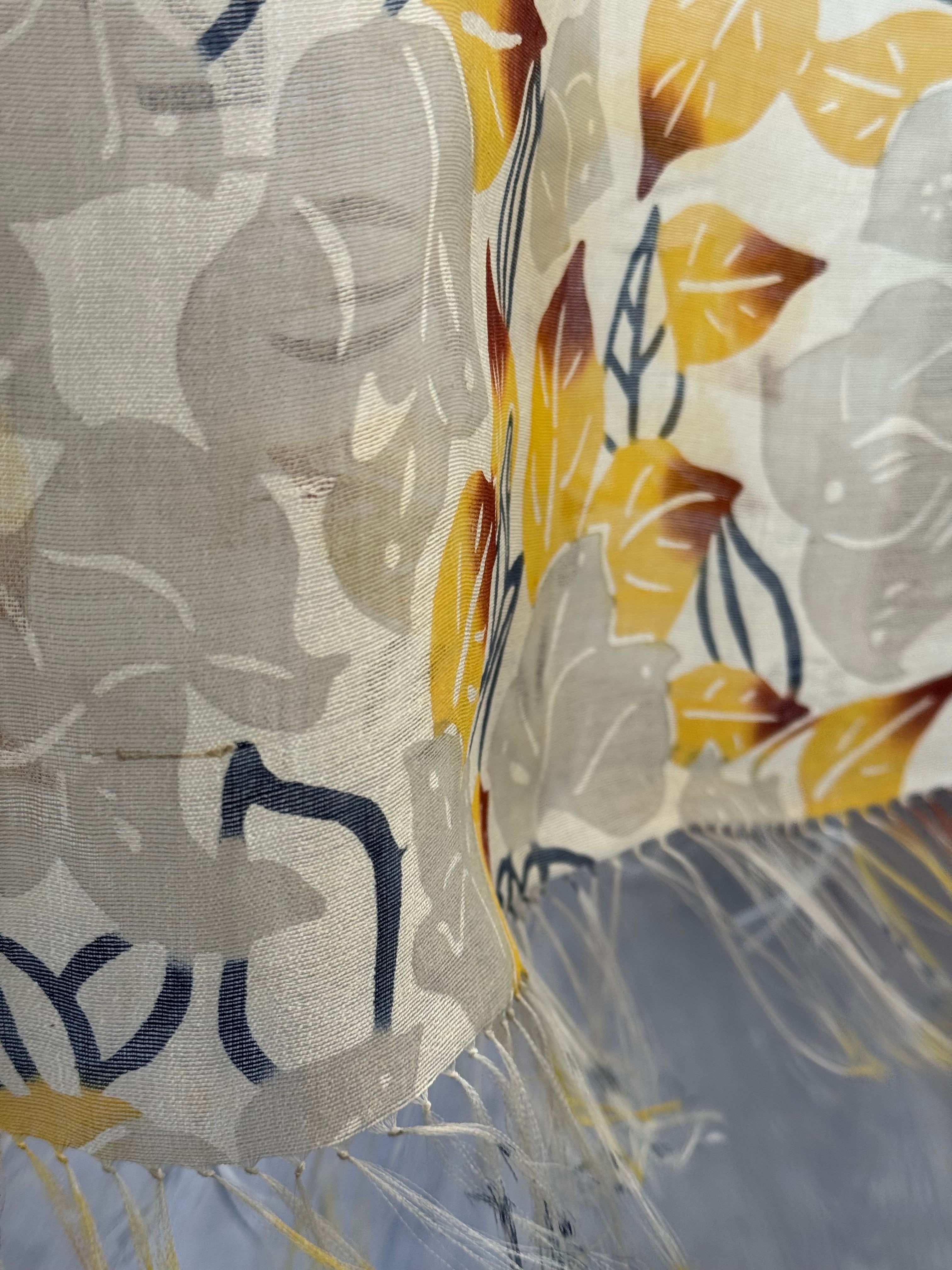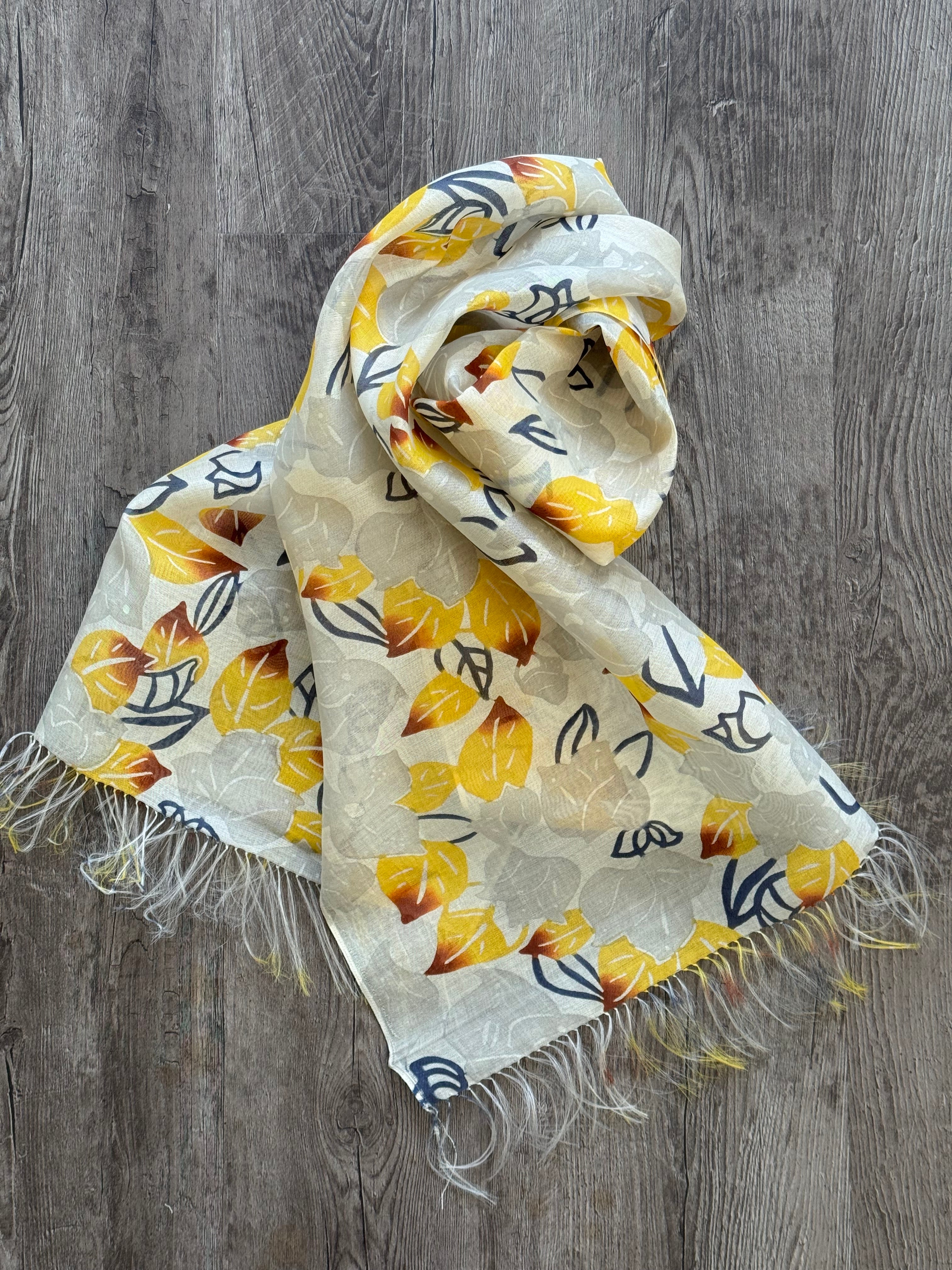 ブーゲンビリアをモチーフにした紅型手染めストール、エリ蚕のシルクに染めているため薄手でとても軽い質感のある一枚です。