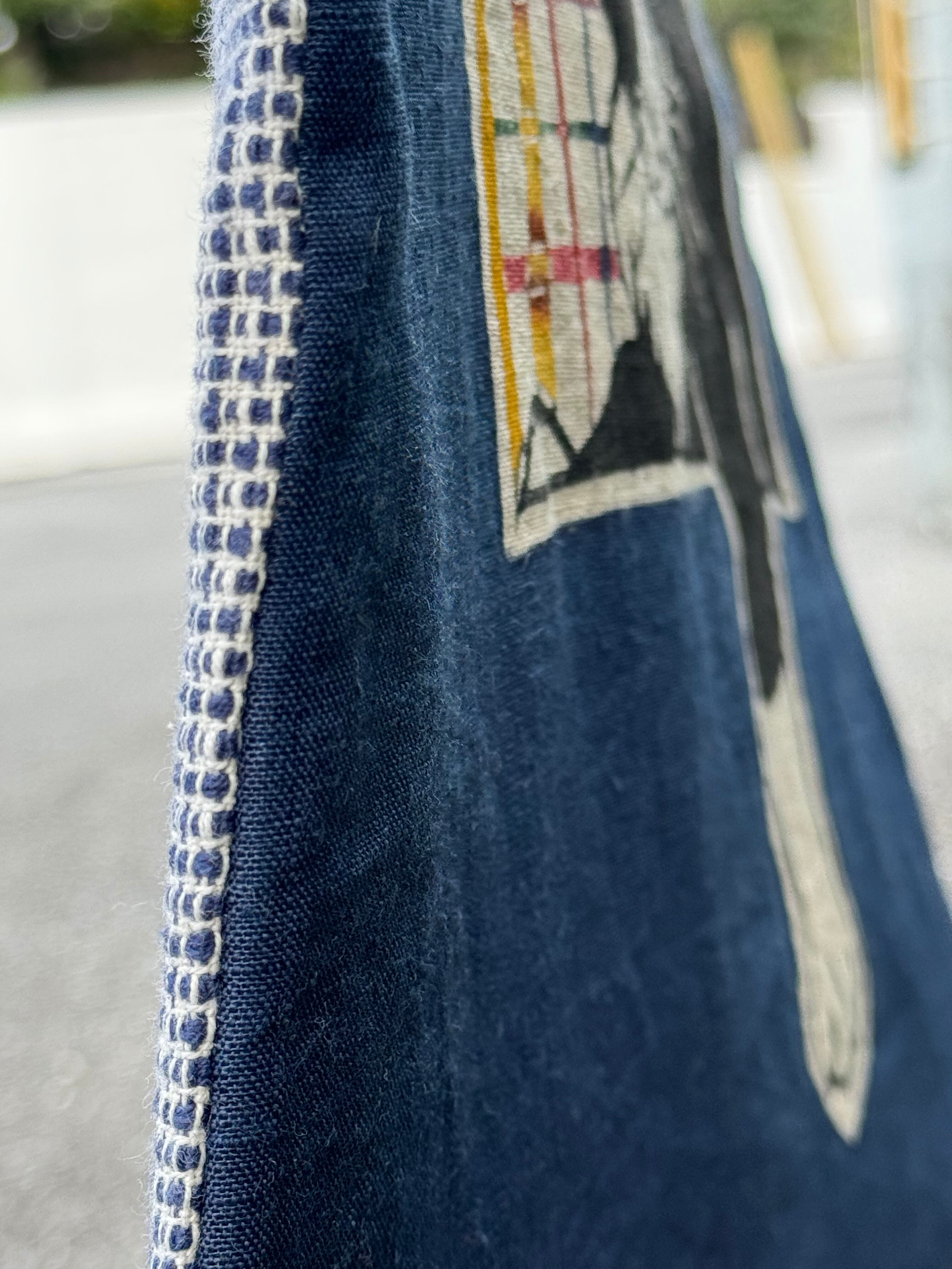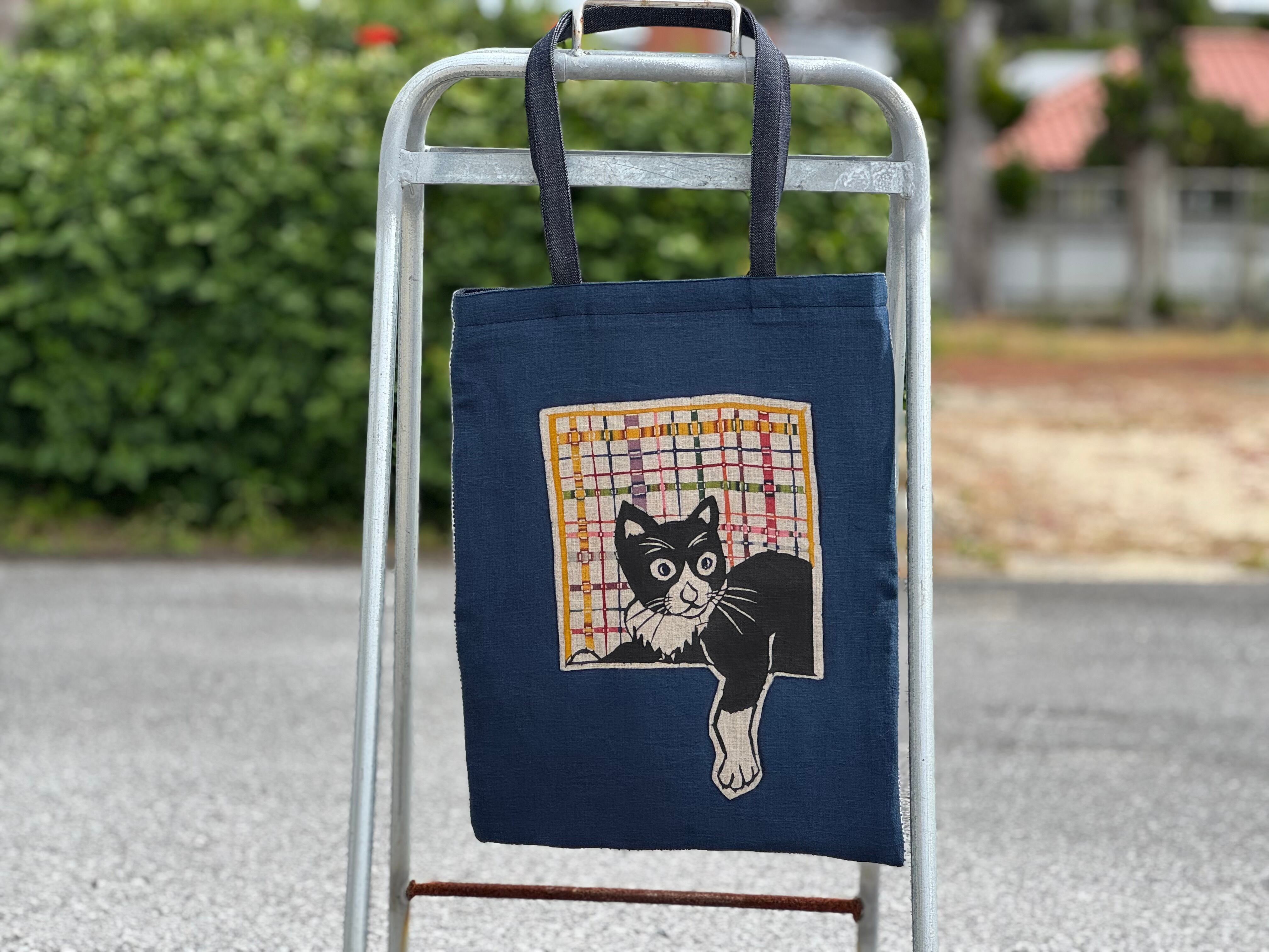 表は紅型で染め、裏はインドの織物を合わせ、中と持ち手部分はデニム素材で組み合わせた仕上がりです。