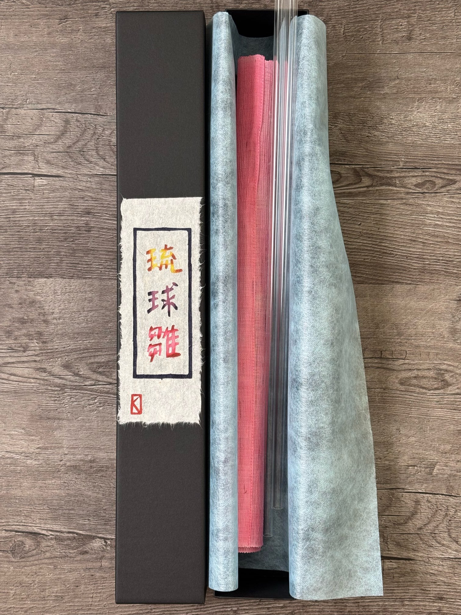 月桃紙に落款をあしらった箱書きも手染めしています。専用の紙箱にお入れしてお届けしますので、 初節句のお祝いや、沖縄好きな方への特別な贈り物にも。 すぐに飾れるアクリル棒(上下)をセットにした、贈り手と受け取り手の双方に寄り添う仕様です。